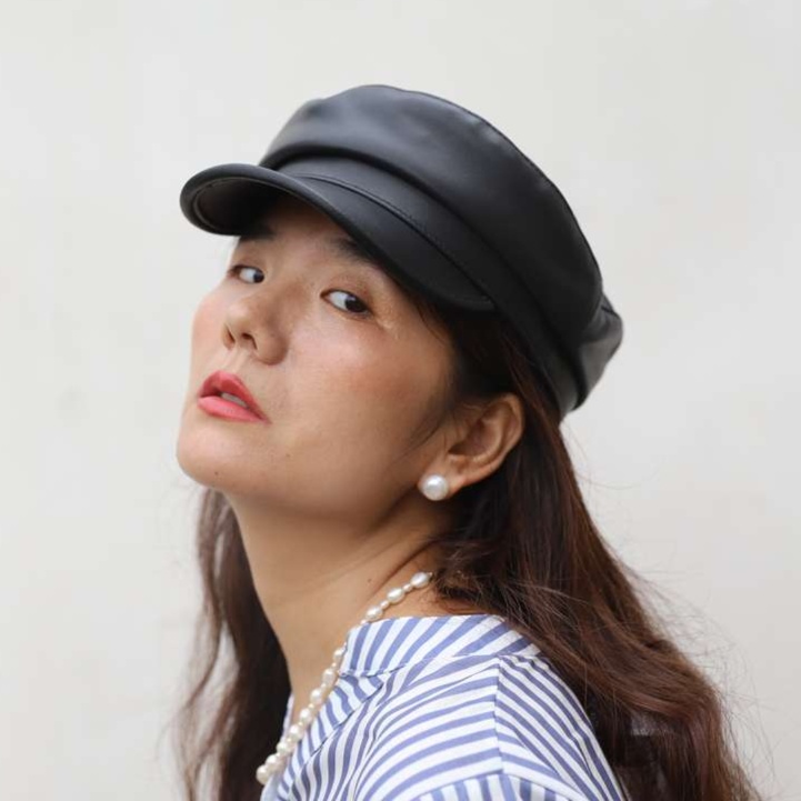 キャスケットのシルエットが都会的で、爽やかな印象を与える洗練された雰囲気